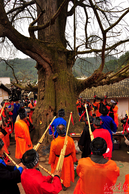 寨老引领众人来到寨中央的千年银杏树下进行祭树,寨老高举牛角、男人们吹起芦笙围着古树转圈,司仪唱起“古歌”祈祷