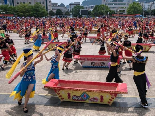 打榔舞,是崇左市天等县的壮族传统民俗舞蹈,用于酬神、还愿、祭祀、娱乐等活动,起源于唐代武德年间。打榔舞主要道具为木榔,音乐响起后,每人用一米多长的木杵有节奏的敲击榔壁、榔底和榔边,动作欢快有力,以此来表达壮族人民对五谷丰登、六畜兴旺、幸福吉祥的祈求和渴望。表演者不分男女老少,有二人对打、四人对打、多人交错对打等多种方式。